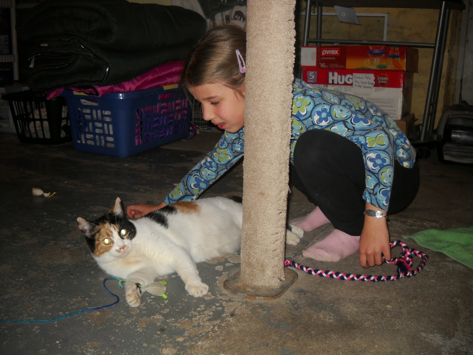 The next few days were filled with hair-raising anticipation. We went on a kid-led shopping spree for cat supplies and spent hours arranging everything just-so in the basement. We hoped to bring Liana home on Monday but there had been a pile of adoption applications turned in just before ours and we ended up having to wait until Wednesday before everything was in place. The girls had a dreadful time waiting, but we filled the evening by wrapping yarn and sewing carpet scraps around poles in the basement so Liana would have a nice place to sharpen her claws. We even building a cat tower together. "I like working together," Hannah said. "She's going to be so happy here."--------